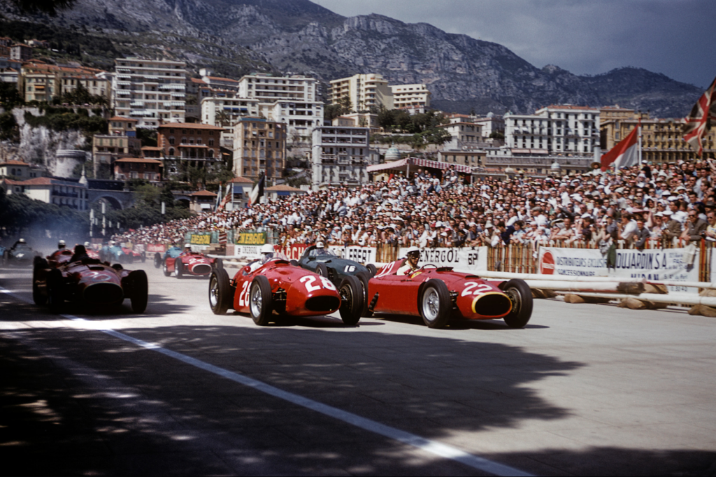Juan Manuel Fangio led at the start of the Monaco GP in his Ferrari-Lancia D50, barely ahead of his friend and rival Stirling Moss in his Maserati 250F.