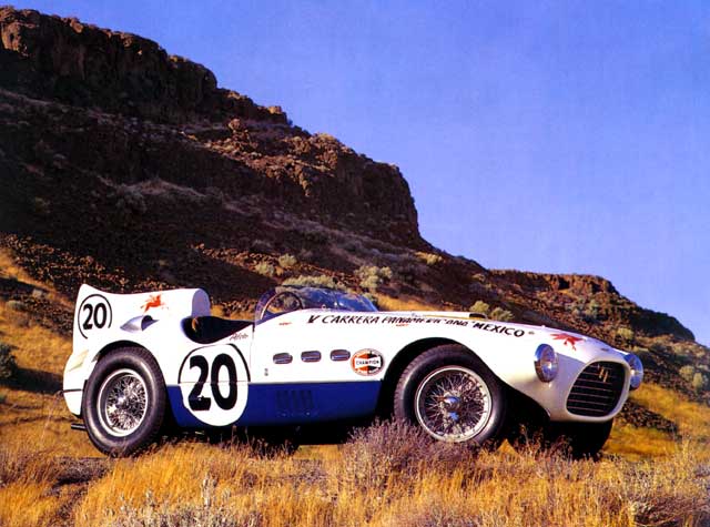 Several Ferraris were entered in the Carrera for 1954, which was the final year of the original race. Phil Hill and Richie Ginther teamed up again, driving a white Vignale-bodied 375 MM Spyder. The 375 MM was very similar to the 340 Mexico in concept, but with an even larger engine. They were in contention for the win until they ran out of fuel on the penultimate stage. They gave it all they had anyway, averaging 137 mph for the 572-mile blast from Chihuahua to Ciudad Juárez. The race was won by Umberto Magloli in another 375MM Spider, who averaged 107 mph for the entire race! This was the last time the original Carrera would be run. So, the 340 Mexico was the only car ever designed for the Carrera Panamericana.